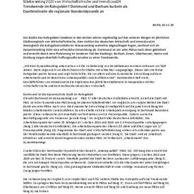 Obwohl Dortmund im Niveauranking nur Platz 57 aller deutschen Großstädte erreicht, erzielt die Stadt mit Platz 16 in der Dynamik eine Platzierung im oberen Tabellendrittel. Im Vergleich zum Vorjahr klettert die Stadt damit um zehn Plätze nach vorn. Die dynamische Entwicklung ist maßgeblich auf die gute Entwicklung des lokalen Arbeitsmarkts zurückzuführen. So entwickelte sich die Arbeitsplatzversorgung in Dortmund besonders positiv. Diese verbesserte sich innerhalb von fünf Jahren um 5,9 Prozentpunkte. Zudem wuchs die Beschäftigungsrate von Frauen an (jeweils Rang 7 im Vergleich aller deutschen Großstädte). Die Arbeitslosenquote der unter 25-Jährigen ist zwischen 2014 und 2019 um 3,3 Prozentpunkte zurückgegangen (Rang 2 aller deutschen Großstädte), die Arbeitslosenquote der Älteren (55 Jahre und älter) sogar um 3,7 Prozentpunkte (Rang 10). Programme der Stadt und Wirtschaftsförderung wirken sich scheinbar positiv aus. Der Pendlersaldo konnte ebenfalls in Dortmund gesteigert werden (Rang 5). Die Stadt wird als Arbeitsort attraktiver und erreicht damit insgesamt einen siebten Platz im Teilbereich „Arbeitsmarkt” des Dynamikrankings.