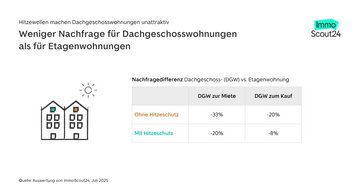 „Auf unserem Portal sehen wir, dass Dachgeschosswohnungen zur Miete und zum Kauf deutlich weniger Kontaktanfragen erhalten als vergleichbare Etagenwohnungen“, sagt Daniel Hendel, Geschäftsführer von ImmoScout24. „Extreme Hitze in den Sommermonaten macht diese Wohnungen für viele Suchende unattraktiv. Fehlende barrierefreie Zugänge und durch Dachschrägen eingeschränkte Wohnflächen verstärken diesen Effekt.“