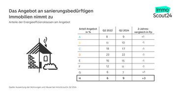 „Es kommen momentan vermehrt Immobilien mit schlechter Energieeffizienz auf den Markt. Das sehen wir an den Angeboten von Immobilien mit Energieeffizienzklasse G und H, die in den letzten zwei Jahren auf unserer Plattform deutlich zugenommen haben“, sagt Kristian Kehlert, Leiter Marktanalyse bei ImmoScout24. „Die Preise für Immobilien mit Klasse E bis H sind deutlich günstiger als für energieeffizientere Immobilien. Den Sanierungsbedarf sollten Kaufinteressierte bei solchen Immobilien vorab gut kalkulieren und entsprechend für die Preisverhandlung nutzen.“