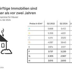 Das WohnBarometer für Q2 2024 zeigt, dass sich die Angebotspreise für Häuser und Wohnungen deutschlandweit aktuell zum Großteil seitwärts bewegen. Dennoch liegen die Preise nach den Abwertungen im Jahr 2023 noch unter dem Preisniveau von 2022. Das gilt insbesondere für unsanierte Immobilien mit schlechter Energieeffizienz. Lag der durchschnittliche Angebotspreis für Häuser und Wohnungen mit Energieeffizienzklasse E im zweiten Quartal 2022 bei knapp unter 4.000 Euro pro Quadratmeter, sind es im zweiten Quartal 2024 rund 3.500 Euro. Das entspricht einem Preisrückgang von 11,5 Prozent in zwei Jahren. Bei den schlechteren Klassen F bis H fallen die durchschnittlichen Preisrückgänge mit 12,0 bis 13,8 Prozent noch etwas größer aus. Für Immobilien mit der schlechtesten Energieklasse H ist der durchschnittliche Angebotspreis von 3.015 Euro pro Quadratmeter im zweiten Quartal 2022 auf 2.610 Euro gesunken. Die Immobilien sind im Schnitt 13,4 Prozent günstiger als vor zwei Jahren. Trotz der geringeren Angebotspreise sollten Kaufinteressierte den Sanierungsbedarf nicht vernachlässigen. Der Modernisierungsrechner von ImmoScout24 gibt in wenigen Schritten eine erste Kosteneinschätzung für geplante Modernisierungsmaßnahmen.