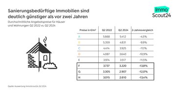 Für die Auswertung der Verteilung der Energieeffizienzklassen wurden alle Anzeigen von Häusern und Wohnungen in Deutschland analysiert, die im zweiten Quartal 2022 und 2024 bei ImmoScout24 inseriert waren. Für die Auswertung der Preisentwicklung wurden alle Angebote für Häuser und Wohnungen in kreisfreien Städten mit Baujahr bis 1990 berücksichtigt, die im zweiten Quartal 2022 und 2024 inseriert waren. Bei den angegebenen Preisen handelt es sich um Durchschnittspreise.