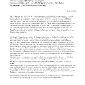 Mit durchschnittlich 5.969 Euro pro Quadratmeter ist eine Eigentumswohnung am Hamburger Millerntor-Stadion im Vergleich der vier Städte am teuersten. Die Heimspielstätte von St. Pauli liegt zentral im Bezirk Hamburg-Mitte. Innerhalb von fünf Jahren stiegen die Kaufpreise hier im Durchschnitt um 54 Prozent. Auch die Hamburger HSV-Fans müssen mittlerweile über 5.000 Euro den Quadratmeter für den Kauf einer Wohnung und die Nähe zum Heim-Stadion zahlen, obwohl es deutlich weiter draußen gelegen ist, im nord-westlichen Bezirk Altona. Damit Berliner Hertha-Fans möglichst nah am Olympiastadion ihre eigenen vier Wände genießen können, müssen sie mit durchschnittlich 4.231 Euro pro Quadratmeter Kaufpreis kalkulieren. Für Derby-Fans sind die Kaufpreise An der Alten Försterei noch interessant. Hier liegen die Durchschnittspreise mit 3.228 Euro pro Quadratmeter auf dem vorletzten Platz im Ranking.