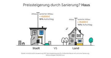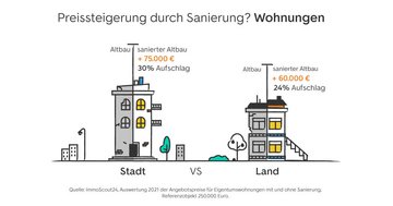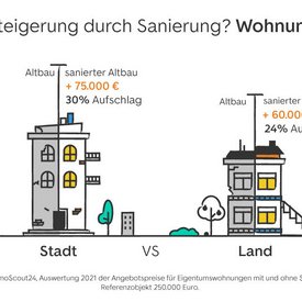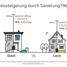 Sanierte Wohnungen neueren Baujahrs zwischen 1949 und 1975 werden in der Stadt 14 Prozent teurer angeboten als unsanierte. Auf dem Land liegt der Unterschied bei 15 Prozent. Ein Einfamilienhaus dieser Altersklasse lässt sich nach einer Sanierung 22 Prozent teurer anbieten, auf dem Land um 16 Prozent. Damit hat die Sanierung bei neueren Einfamilienhäusern einen größeren Effekt als bei Altbauhäusern.
