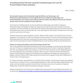 ImmoScout24 hat die Effekte von Modernisierungs- und Sanierungsmaßnahmen auf das Preisniveau von Immobilien untersucht. Die Analyse des Objektzustands und der Ausstattungsqualität zeigt, dass städtisch gelegene Altbauwohnungen mit Baujahr bis 1949 nach Sanierung rund 30 Prozent teurer inseriert werden als unsanierte. Auf dem Land liegt der Unterschied für sanierte Altbauwohnungen bei 24 Prozent. Auch für Einfamilienhäuser lohnt sich eine Sanierung. In der Stadt liegt der Aufschlag für Altbauten bei 18 Prozent, auf dem Land sind es 14 Prozent.
