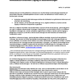 Mehr als 11 Millionen Haushalte in Deutschland haben Anspruch auf eine Sozialwohnung – gleichzeitig gibt es nur rund 1,1 Millionen entsprechende Wohnungen. Studien gehen von einem Defizit von bis zu 1,4 Millionen bezahlbaren Wohnungen aus. Um das vorhandene Angebot besser sichtbar zu machen und den Zugang zu gefördertem Wohnraum zu erleichtern, können Sozialwohnungen ab sofort kostenlos auf ImmoScout24 veröffentlicht werden.