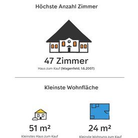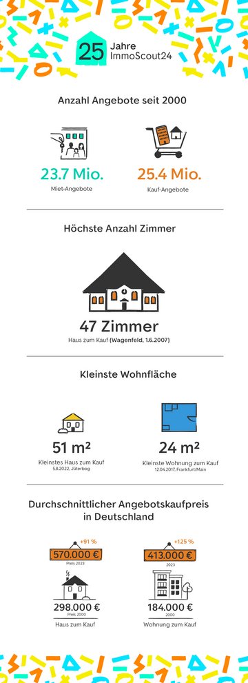 Seit der Jahrtausendwende wurden auf ImmoScout24 etwa 50 Millionen Immobilienanzeigen inseriert. Während der durchschnittliche Angebotskaufpreis für ein Einfamilienhaus im Jahr 2000 bei rund 298.000 Euro lag, hat sich dieser aktuell um rund 91 Prozent auf 570.000 Euro fast verdoppelt. Eine Eigentumswohnung kostete vor 23 Jahren durchschnittlich 184.000 Euro. Heute muss man mit 413.000 Euro mehr als das Doppelte aufbringen. Das Haus mit den meisten Zimmern wurde 2007 in Wagenfeld auf ImmoScout24 inseriert und hatte 47 Zimmer.