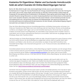 Immobilienanbieter können die Funktion „Online-Besichtigung möglich“ kostenlos und mit wenigen Klicks in ihrem ImmoScout24-Account freischalten. Die eigenen Inserate werden dann optisch hervorgehoben, so dass Suchende auf der Plattform www.immobilienscout24.de sofort sehen, dass sie eine Online-Besichtigung durchführen können. In der App wird der Hinweis „Online-Besichtigung“ ab nächster Woche zu sehen sein.