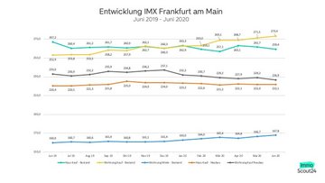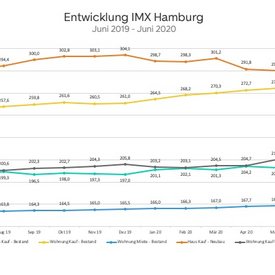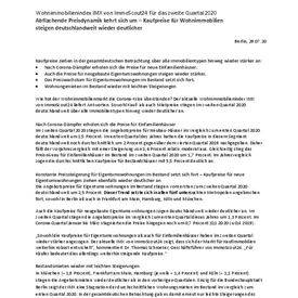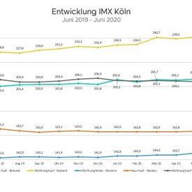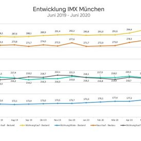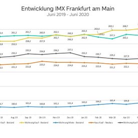 Für neugebaute Einfamilienhäuser zeigt der IMX für das zweite Quartal 2020 ein differenzierteres Bild. In München stiegen die Kaufpreise für neugebaute Häuser um 2,7 Prozent, in Berlin um 1,0 Prozent und in Köln um 0,1 Prozent. Hingegen gingen die Angebotspreise für Einfamilienhäuser im Neubau vom ersten zum zweiten Quartal 2020 in Frankfurt am Main leicht mit 0,1 Prozent und in Hamburg um 2,8 Prozent zurück.