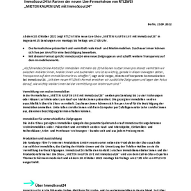 Ab dem 10. Oktober 2022 zeigt RTLZWEI die neue Live-Show „MIETEN KAUFEN LIVE mit ImmoScout24“ in insgesamt 15 Sendungen von montags bis freitags um 17:05 Uhr.