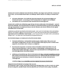 ImmoScout24 verstärkt seine Maßnahmen gegen Betrug mit einem umfassenden Sicherheitspaket – und setzt damit neue Maßstäbe. Durch kontinuierliche Investitionen in Sicherheitsarchitektur, gezielte Nutzeraufklärung und enge Kooperationen ist ImmoScout24 heute schon die führende und sicherste Plattform für die digitale Immobiliensuche in Deutschland.