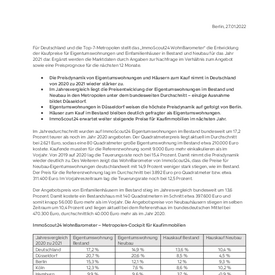 Für Deutschland und die Top-7-Metropolen stellt das „ImmoScout24 WohnBarometer“ die Entwicklung der Kaufpreise für Eigentumswohnungen und Einfamilienhäuser in Bestand und Neubau für das Jahr 2021 dar. Ergänzt werden die Marktdaten durch Angaben zur Nachfrage im Verhältnis zum Angebot sowie eine Preisprognose für die nächsten 12 Monate.