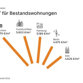 Bei Einfamilienhäusern zeigt sich die Trendumkehr noch deutlicher. Bestehende Einfamilienhäuser wurden im zweiten Quartal 2022 in allen Metropolen außer in Berlin deutlich günstiger angeboten als im ersten Quartal. In Köln reduzierten sich die Durchschnittspreise innerhalb von drei Monaten um 4,0 Prozent. Somit war ein Einfamilienhaus mit 140 Quadratmetern und 600 Quadratmeter Grundstück wieder für unter 5.000 Euro pro Quadratmeter und damit für rund 690.600 Euro zu haben – gegenüber knapp 720.000 Euro im ersten Quartal. Auch in Düsseldorf (- 3,7 %), München (- 3,6 %), Stuttgart (- 2,0 %), Frankfurt (-1,4 %) und Hamburg (- 1,3 %) gaben die Angebotspreise deutlich nach. Einzig Berlin behauptete ein leichtes Plus von 1,4 Prozent. Die Bundeshauptstadt blieb mit Durchschnittpreisen von unter 5.100 Euro pro Quadratmeter nach Köln und mit knapp 300 Euro Abstand zu Düsseldorf die zweitgünstigste Metropole in diesem Segment.