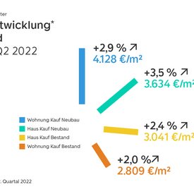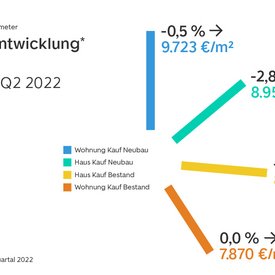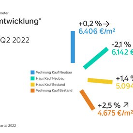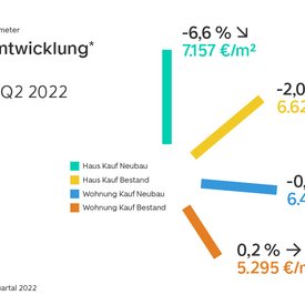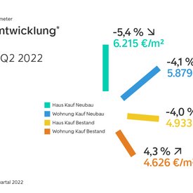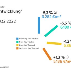 Die Kaufpreisdynamik für Wohnimmobilien hat sich im zweiten Quartal 2022 deutschlandweit deutlich abgeschwächt.