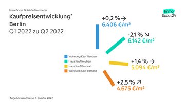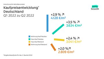 In der gesamtdeutschen Betrachtung erlebten Wohnimmobilien zum Kauf noch einen leichten Preisauftrieb. So wurden Bestands-Eigentumswohnungen bei ImmoScout24 im zweiten Quartal 2022 um 2,0 Prozent teurer angeboten als im ersten Quartal des Jahres. Neubau-Eigentumswohnungen verteuerten sich im Durchschnitt um 2,9 Prozent. Bei Einfamilienhäusern im Bestand stiegen die Angebotskaufpreise um 2,4 Prozent und im Neubau um 3,5 Prozent. Damit hat sich die Preisdynamik gegenüber den letzten Quartalen deutlich abgeschwächt. Im ersten Quartal zeigte das ImmoScout24 WohnBarometer noch eine Steigerung der Angebotskaufpreise von Bestands-Eigentumswohnungen um 5,1 Prozent und im Neubau von 3,0 Prozent. Auch Einfamilienhäuser verteuerten sich im ersten Quartal im Bestand noch um 4,6 Prozent und im Neubau um 4,5 Prozent