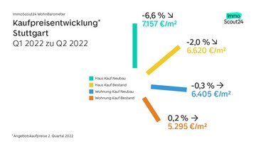 Für neue Einfamilienhäuser bis zu zwei Jahre Baualter fällt der Preisrückgang noch deutlicher aus. In Stuttgart gingen die durchschnittlichen Angebotskaufpreise auf ImmoScout24 vom ersten zum zweiten Quartal um 6,6 Prozent zurück. Sie haben sich damit pro Quadratmeter um über 500 Euro reduziert. Auch in Düsseldorf, Köln und Hamburg wurden Neubau-Häuser im Durchschnitt über 5 Prozent günstiger angeboten. München und Berlin zeigen etwas moderatere Preiskorrekturen von 2,8 bzw. 2,1 Prozent. Einzig Frankfurt am Main liegt mit einem Minus von 1,7 Prozent darunter. Neubau-Einfamilienhäuser bleiben in Düsseldorf mit rund 5.800 Euro pro Quadratmeter mit einem Abstand von gut 300 Euro vor Berlin, Hamburg und Köln am günstigsten, während sie in Stuttgart mit über 7.150 Euro und München mit rund 8.950 Euro pro Quadratmeter am teuersten sind.