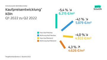 Für viele Kaufinteressenten ist der Traum vom Eigenheim durch das hohe Zinsniveau von über drei Prozent deutlich schwieriger realisierbar als noch vor einem halben Jahr. Die monatlichen Raten haben sich gegenüber dem Tiefstand der Zinsen im letzten Jahr für ein typisches Finanzierungsmodell bis auf das Doppelte verteuert. Rascher als erwartet schlägt sich die Zurückhaltung von Käuferseite auf die Entwicklung der Kaufpreise nieder. Wohnungen und Einfamilienhäuser zum Kauf haben in den deutschen Metropolen Düsseldorf, Frankfurt am Main, Hamburg, Köln, München und Stuttgart in den Angebotspreisen um bis zu 6,6 Prozent nachgegeben. Das zeigt das ImmoScout24 WohnBarometer für das zweite Quartal 2022.
