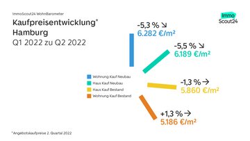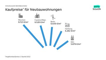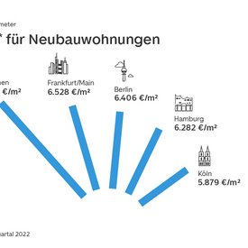 Neubau-Eigentumswohnungen mit einem Baualter von bis zu zwei Jahren zeigen hingegen im zweiten Quartal 2022 in so gut wie allen Metropolen einen deutlichen Trend zur Preiskorrektur. Sie wurden in Hamburg 5,3 Prozent günstiger angeboten als noch im ersten Quartal des Jahres. Der durchschnittliche Angebotskaufpreis pro Quadratmeter hat sich damit von 6.634 Euro im ersten Quartal 2022 um 352 Euro auf 6.282 Euro reduziert. Für die zugrunde gelegte Referenzwohnung von 80 Quadratmetern beträgt die Preisreduktion damit 28.160 Euro. In Düsseldorf und Köln wurden Neubau-Wohnungen zum Kauf im zweiten Quartal 4,1 Prozent günstiger angeboten, in Frankfurt am Main um 1,7 Prozent. Köln liegt damit als einzige Metropole mit einem durchschnittlichen Angebotspreis von rund 5.880 Euro wieder unter der Schwelle von 6.000 Euro pro Quadratmeter. München zeigt einen Preisrückgang von 0,5 Prozent und Stuttgart von 0,3 Prozent, während Berlin bei einem leichten Plus von 0,2 Prozent stagnierte. Somit liegen die durchschnittlichen Kaufpreise in Hamburg mit 6.280 Euro, Berlin und Stuttgart mit jeweils rund 6.400 Euro, Frankfurt am Main mit rund 6.500 Euro und Düsseldorf mit rund 6.600 Euro nahezu gleichauf.