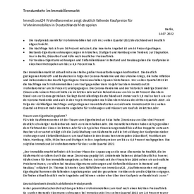 Das ImmoScout24 WohnBarometer ist der Marktreport zur Entwicklung des Immobilienmarkts. Herausgeber ist ImmoScout24: Deutschlands führende Online-Plattform für Wohnimmobilien. Das ImmoScout24 WohnBarometer gibt die Preisentwicklung in realen Angebotspreisen wieder, ergänzt um einen Indikator zum Verhältnis von Angebot und Nachfrage sowie eine Preisprognose für die nächsten 12 Monate. Die Datenbasis umfasst über 8,5 Millionen Inserate der letzten fünf Jahre auf ImmoScout24. Die Werte werden für Referenzobjekte für den jeweils betrachtetem Immobilientyp durch einen Algorithmus aus dem Bereich des maschinellen Lernens ermittelt. Für Wohnungen zum Kauf wird eine Drei-Zimmer-Wohnung mit 80 Quadratmetern Wohnfläche zugrunde gelegt. Das betrachtete Einfamilienhaus hat 140 Quadratmeter Wohnfläche und einen Grundstücksanteil von 600 Quadratmetern. Die Kategorie Neubau enthält alle Angebote mit einem Baualter von maximal zwei Jahren zum jeweiligen Bestimmungszeitpunkt. Die Nachfrage im Verhältnis zum Angebot wird berechnet auf Basis der Kontaktanfragen pro Inserat des jeweiligen Immobilientyps pro Woche. Es handelt sich um einen normierten Wert, um unterschiedliche Standzeiten der Anzeigen auf dem Portal auszugleichen. Für die Preisprognose bildet der angewandte Algorithmus ebenfalls die Grundlage. Dazu fließen aktuelle Einwohnersalden sowie der verfügbare und geplante Wohngebäudebestand in die Berechnung ein. Die aktuellen Mietpreise beziehen sich immer auf den letzten Datenpunkt im Marktreport und stehen damit für den Angebotspreis im ersten Quartal 2022.