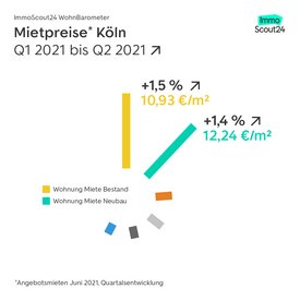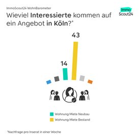 Nach Berlin zogen in Köln die Angebotsmieten von Bestandswohnungen im zweiten Quartal 2021 mit einem Plus von 1,5 Prozent am deutlichsten an. In Frankfurt am Main, München und Hamburg fiel die Entwicklung mit 1,3 Prozent, 0,7 Prozent und 0,3 Prozent deutlich moderater aus als in den Vorquartalen. Laut ImmoScout24 WohnBarometer gehen auf jede inserierte Bestands-Mietwohnung in Köln 43 Kontaktanfragen pro Woche ein. In Frankfurt am Main sind es demgegenüber nur 12. Das ImmoScout24 WohnBarometer prognostiziert demnach, dass die Angebotsmieten im Bestand in Köln in den nächsten 12 Monaten um 4,3 Prozent anziehen, gefolgt von München mit 3,1 Prozent Aufgrund der hohen Neubauquote und der dadurch relativ ausgeglichenen Marktlage werden die Mietpreise mit 2,7 Prozent in Hamburg am geringsten steigen.