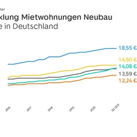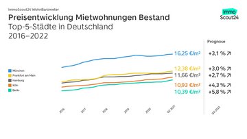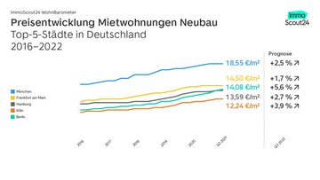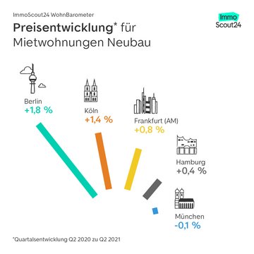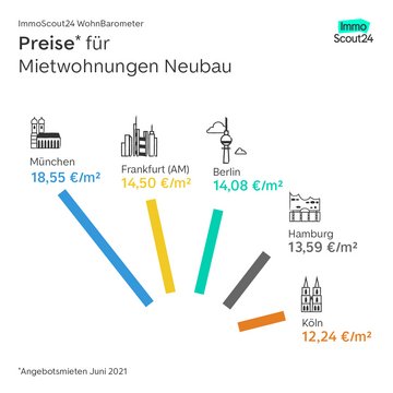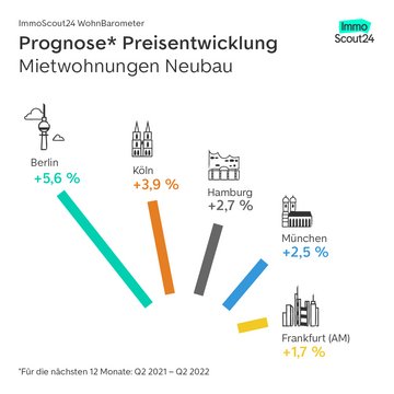 Für Berlin erwartet ImmoScout24 mit 5,6 Prozent in den kommenden zwölf Monaten weiterhin die stärksten Preiszuwächse bei den Neubaumieten. Auch für Köln prognostiziert das ImmoScout24 WohnBarometer einen Anstieg um 3,9 Prozent. In Frankfurt am Main werden die Mietpreise für Neubauwohnungen mit 1,7 Prozent voraussichtlich am geringsten steigen.