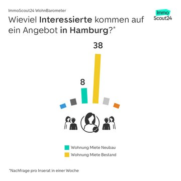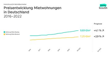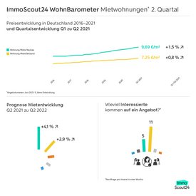 Deutschlandweit übersteigt die Nachfrage nach Mietwohnungen weiterhin das Angebot mit durchschnittlich elf Anfragen pro Inserat und Woche im Bestand sowie fünf Anfragen pro Woche auf Neubau-Mietwohnungen. Für die nächsten zwölf Monate prognostiziert das WohnBarometer in der gesamtdeutschen Betrachtung eine moderate Entwicklung der Angebotsmieten von 2,9 Prozent für Bestandswohnungen. Im Neubau erwartet ImmoScout24 bis zum zweiten Quartal 2022 einen Anstieg um 4,1 Prozent. Für die Preisprognose fließen aktuelle Einwohnersalden sowie der verfügbare und geplante Wohngebäudebestand in die Berechnung ein.