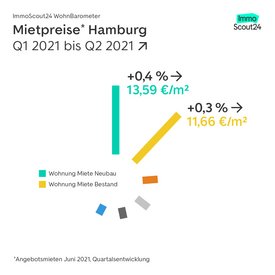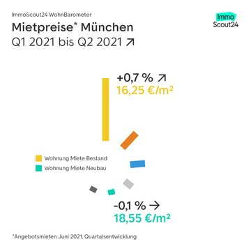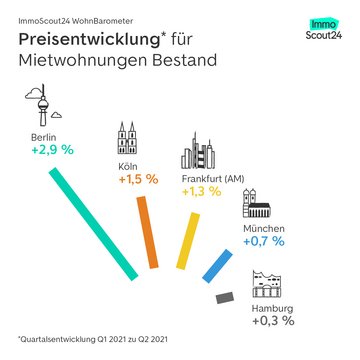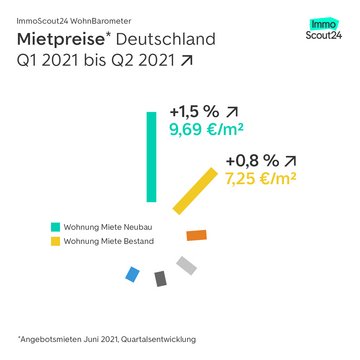 Laut dem ImmoScout24 WohnBarometer sind die Mietpreise Im zweiten Quartal 2021 deutschlandweit nur noch leicht gestiegen – für Bestandswohnungen um 0,8 Prozent und für neugebaute Wohnungen um 1,5 Prozent. Damit schwächte sich die Entwicklung gegenüber dem Vorquartal deutlich ab. Im ersten Quartal wurden Wohnungen im Bestand noch 1,8 Prozent und Neubauwohnungen 2,1 Prozent teurer angeboten.