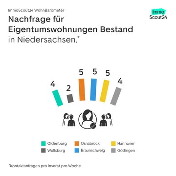 Die Nachfrage nach Eigentumswohnungen im Bestand liegt in allen untersuchten Städten Niedersachsens zwischen vier und fünf Anfragen pro Inserat und Woche, mit Ausnahme von Wolfsburg. Hier kamen lediglich zwei Anfragen pro Woche auf eine inserierte Bestandswohnung. Neubau-Eigentumswohnungen erreichen im Mittel zwischen eine und drei Anfragen pro Woche.