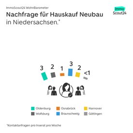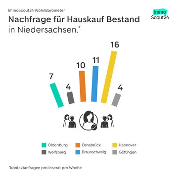 Im Landesvergleich innerhalb Niedersachsens ist die Nachfrage mit 16 Anfragen pro inseriertem Bestandshaus pro Woche in Hannover am größten. Ebenfalls hoch war die Nachfrage in Braunschweig mit elf sowie in Osnabrück mit zehn Anfragen. Deutlich geringer fällt die Nachfrage für neugebaute Einfamilienhäuser aus, die im Durchschnitt 300 bis 500 Euro pro Quadratmeter teurer angeboten werden.