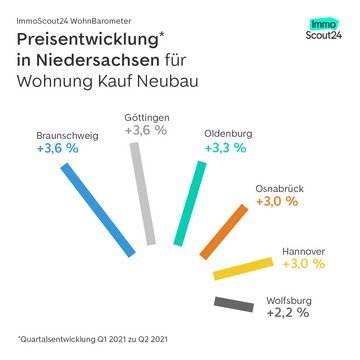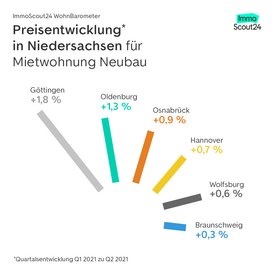Im Neubau zeigt das ImmoScout24 WohnBarometer die höchsten Preissteigerungen für Eigentumswohnungen in Braunschweig und Göttingen mit jeweils plus 3,6 Prozent auf 3.362 und 3.815 Euro pro Quadratmeter. Damit ist Göttingen aufgrund der dynamischen Preisentwicklung im niedersächsischen Städtevergleich in diesem Segment am teuersten.