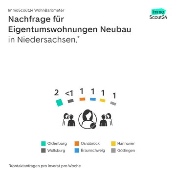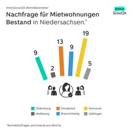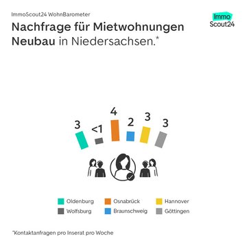Die Universitätsstadt Göttingen verzeichnet mit durchschnittlich 9,78 Euro die höchsten Angebotsmieten pro Quadratmeter im Bestand, am niedrigsten liegen sie mit 7,91 Euro in Osnabrück. Neubau-Mietwohnungen sind in Wolfsburg mit 10,74 Euro pro Quadratmeter am teuersten, in Osnabrück mit 9,14 Euro am günstigsten. In der Landeshauptstadt Hannover rangieren die Angebotsmieten im Bestand bei 8,85 Euro pro Quadratmeter. Dennoch zieht Hannover im Bestandsegment mit 19 Kontaktanfragen pro Inserat und Woche die höchste Nachfrage auf sich. Die geringste Konkurrenz gibt es in Wolfsburg mit lediglich zwei Anfragen pro Wohnungsinserat und Woche im Bestand sowie weniger als einer Anfrage pro Woche auf Neubau-Mietwohnungen.
