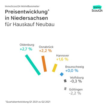 In Oldenburg zogen die Angebotskaufpreise für Einfamilienhäuser im Bestand im zweiten Quartal mit einem Plus von 7,1 Prozent gegenüber dem ersten Quartal auf einen Quadratmeterpreis von 3.097 Euro am stärksten an. Dahinter folgen Wolfsburg mit einem Quartalsanstieg von 6,5 Prozent auf durchschnittlich 2.954 Euro sowie Osnabrück mit plus 6,2 Prozent auf 2.968 Euro pro Quadratmeter. In Göttingen hingegen sanken die Preise für Bestandshäuser vom ersten zum zweiten Quartal 2021 um 0,7 Prozent auf 3.047 Euro pro Quadratmeter.