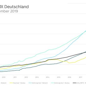 Im gesamtdeutschen Schnitt stiegen die Kaufpreise für neugebaute Wohnungen kontinuierlich weiter. Die Angebotspreise kletterten von Dezember 2018 zu Dezember 2019 auf einen Indexwert von 204,2. Dies bedeutet ein Preiswachstum von 12,8 Prozentpunkten.