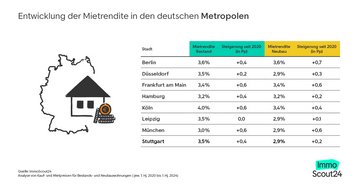 Die Auswertung setzt den Angebotskaufpreis von Eigentumswohnungen mit der Angebotsmiete für Wohnungen auf ImmoScout24 ins Verhältnis. Insgesamt wurden die Preise von 716 Städten mit mehr als 20.0000 Einwohner:innen ausgewertet. Metropolen sind Städte mit mehr als 600.000 Einwohner:innen, Großstädte haben 100.000 bis 600.000 Einwohner:innen und als Mittelstädte gelten Städte mit einer Einwohnerzahl zwischen 20.000 und 100.000 Menschen. Die Brutto-Mietrendite ergibt sich aus dem Quotienten von Kaufpreis (ohne Kaufnebenkosten) und Jahreskaltmiete. Die Daten zu den Angebotsmieten und Angebotskaufpreisen in den Metropolen beruhen auf dem ImmoScout24 WohnBarometer jeweils für das erste Halbjahr 2020 bis 2024.