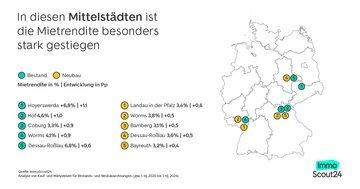 Während Bestandsimmobilien in Städten unter 50.000 Einwohner:innen bereits besonders positive Renditeentwicklung zeigen, ist beim Neubau die Mietrendite vorrangig in größeren Mittelstädten mit mehr als 80.000 Einwohner:innen gewachsen. Spitzenreiter ist Landau in der Pfalz mit seinem hohen Anteil an Studierenden. Die Mietrendite für Neubauwohnungen liegt bei 3,4 Prozent und ist seit 2020 um 0,6 Prozentpunkte gestiegen.