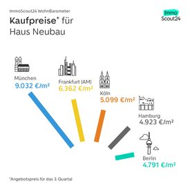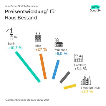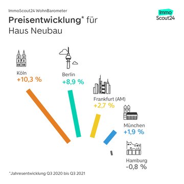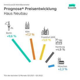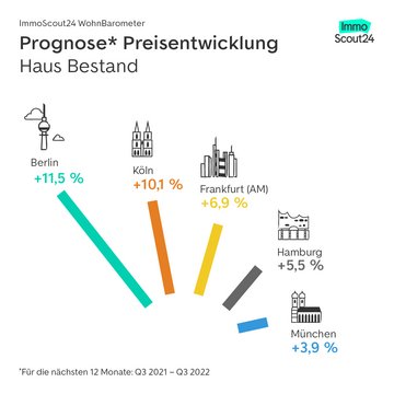 ImmoScout24 prognostiziert die höchsten Preiszuwächse innerhalb eines Jahres für Einfamilienhäuser in Berlin, mit einem Plus von 11,5 Prozent im Bestand und um 9,6 Prozent im Neubau. Demgegenüber erwartet das Wohnbarometer für Einfamilienhäuser im Neubau in München nur ein moderates Preiswachstum von 2,3 Prozent sowie 3,9 Prozent im Bestand, allerdings auf dem deutlich höchsten Ausgangsniveau.