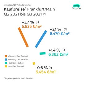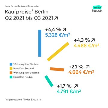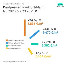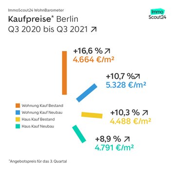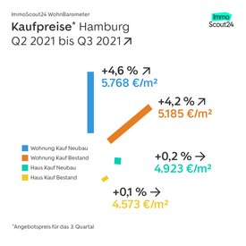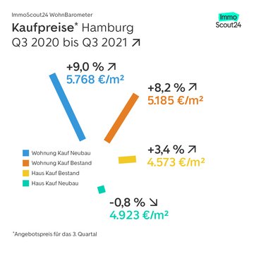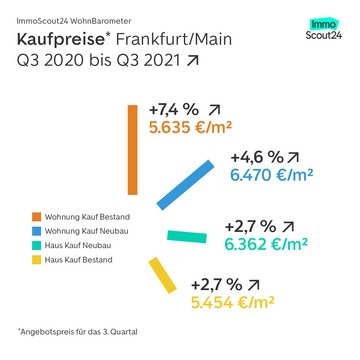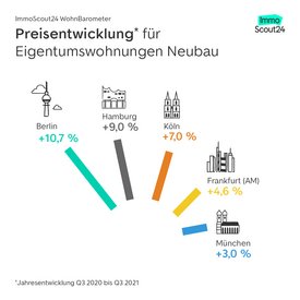Für die Top-5-Metropolen Deutschlands stellt das „ImmoScout24 WohnBarometer“ die Entwicklung der Kaufpreise für das dritte Quartal 2021 dar. Analysegrundlage sind die Inserate für Eigentumswohnungen und Einfamilienhäuser im Bestand und Neubau auf Deutschlands größtem Online-Marktplatz für Immobilien. Ergänzt werden die Marktdaten durch Angaben zur Nachfrage im Verhältnis zum Angebot sowie Preisprognosen für die nächsten 12 Monate.