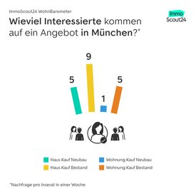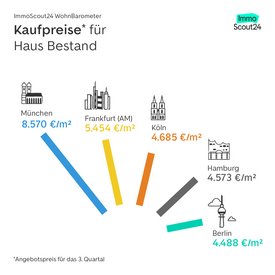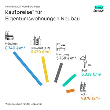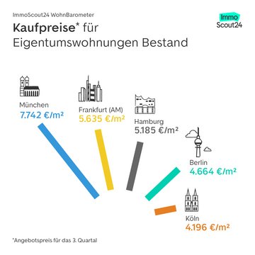 In Berlin fiel die Preisdynamik im dritten Quartal mit 2,1 Prozent für Eigentumswohnungen im Bestand gegenüber 4,8 Prozent im Vorquartal ebenfalls schwächer aus. Sie liegt damit wie in Köln deutlich unter der aktuellen Inflationsrate von 4,1 Prozent. Das Preisniveau liegt in der Hauptstadt mit 4.664 Euro pro Quadratmeter etwas über dem von Köln, aber deutlich unter München, Hamburg und Frankfurt am Main. In der Bundeshauptstadt müssen Kaufende mit durchschnittlich 373.120 Euro für die Referenzwohnung kalkulieren. In München liegen die Angebotspreise mit 7.742 Euro pro Quadratmeter für eine Bestandswohnung im dritten Quartal am höchsten. Sie haben gegenüber dem Vorquartal um 1,9 Prozent zugelegt. Die Nachfrage an der Isar ist mit durchschnittlich fünf Anfragen pro Inserat und Woche ebenfalls hoch.