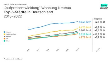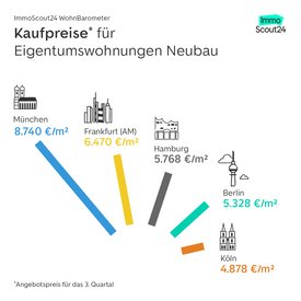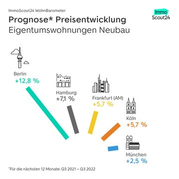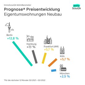 Das ImmoScout24 WohnBaromter prognostiziert auch für Neubau-Eigentumswohnungen in Berlin mit 12,8 Prozent die stärksten Preissteigerungen innerhalb der nächsten 12 Monate. Hamburg folgt mit 7,1 Prozent und Köln sowie Frankfurt am Main mit 5,7 Prozent. In München erwartet ImmoScout24 mit 2,5 Prozent nur noch eine moderate Preisentwicklung.