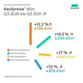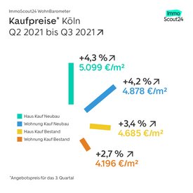 ImmoScout24 WohnBarometer für das dritte Quartal: In Köln und Berlin steigen die Kaufpreise für Eigentumswohnungen nicht mehr so dynamisch wie im Vorquartal – Kaufpreise für Häuser ziehen in Berlin, Köln und München weiter an
