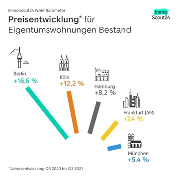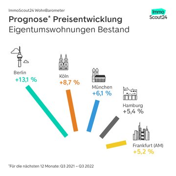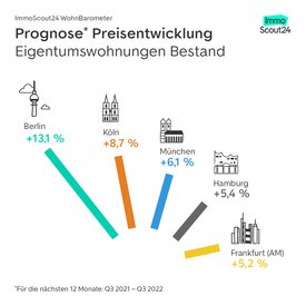 ImmoScout24 erwartet innerhalb der nächsten 12 Monate für Berlin ausgehend von dem im Metropolenvergleich noch relativ moderaten Preisniveau ein Preiswachstum von 13,1 Prozent – und damit den höchsten Preisanstieg für Bestands-Eigentumswohnungen. Auch für Köln erwartet ImmoScout24 aufgrund der hohen Nachfrage ein Plus von 8,7 Prozent. Die geringste Steigerung prognostiziert ImmoScout24 für Frankfurt am Main mit 5,2 Prozent, das mit 5.635 Euro pro Quadratmeter schon auf dem zweithöchsten Preisniveau nach München liegt.
