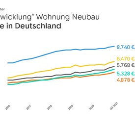 Mit 4,6 Prozent stiegen die Angebotspreise für neugebaute Eigentumswohnungen am stärksten in Hamburg auf 5.768 Euro pro Quadratmeter im dritten Quartal. Eine 80 Quadratmeter große Wohnung kostete damit durchschnittlich 461.440 Euro. In Köln wird das Referenzobjekt im Neubau mit 390.240 Euro gegenüber den anderen vier Metropolstädten am günstigsten angeboten. Hier stiegen die Angebotspreise für eine Neubau-Eigentumswohnung gegenüber dem zweiten Quartal 2021 um 4,2 Prozent und damit wieder stärker als im zweiten Quartal mit 3,3 Prozent. In Berlin legten die Angebotspreise 4,4 Prozent (Q2: 4,3 %) und in Frankfurt am Main 3,1 Prozent (Q2: 4,5 %) zu.
