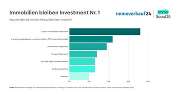 Mehr als ein Drittel der Eigentümer:innen würden einen Verkaufserlös wieder in eine Immobilie investieren (36 Prozent). Danach folgen andere Anlageklassen wie Aktien, ETFs oder Kryptowährungen (22 Prozent) sowie die Deckung der Lebenshaltungskosten (19 Prozent). 14 Prozent würden das Geld in Festgeld oder auf dem Sparbuch anlegen, jeweils 13 Prozent planen Schuldentilgung oder eine große Anschaffung. 10 Prozent möchten den Erlös vererben. Das generelle Vertrauen in die Anlageklasse Immobilie bleibt stark: Drei von vier Befragten (75 Prozent) würden anderen den Immobilienkauf als Investition empfehlen.