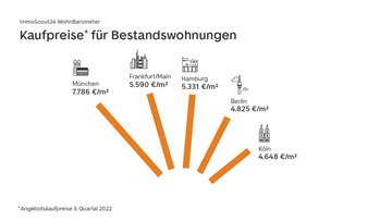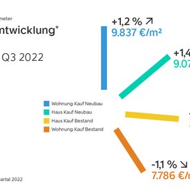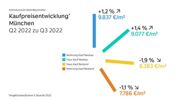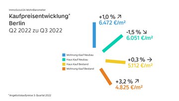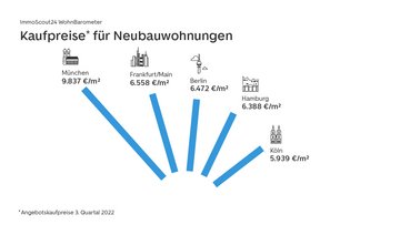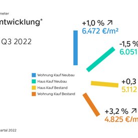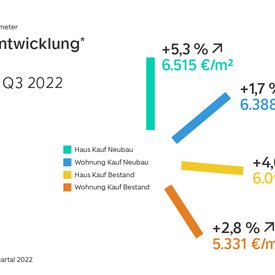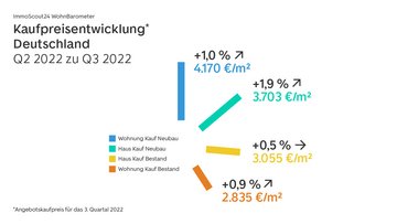 Das ImmoScout24 WohnBarometer ist der Marktreport zur Entwicklung des Immobilienmarkts. Herausgeber ist ImmoScout24: Deutschlands führende Online-Plattform für Wohnimmobilien. Das ImmoScout24 WohnBarometer gibt die Preisentwicklung in realen Angebotspreisen wieder, ergänzt um einen Indikator zum Verhältnis von Angebot und Nachfrage. Die Datenbasis umfasst über 8,5 Millionen Inserate der letzten fünf Jahre auf ImmoScout24. Die Werte werden für Referenzobjekte für den jeweils betrachtetem Immobilientyp durch einen Algorithmus aus dem Bereich des maschinellen Lernens ermittelt. Für Wohnungen zum Kauf wird eine Drei-Zimmer-Wohnung mit 80 Quadratmetern Wohnfläche zugrunde gelegt. Das betrachtete Einfamilienhaus hat 140 Quadratmeter Wohnfläche und einen Grundstücksanteil von 600 Quadratmetern. Die Kategorie Neubau enthält alle Angebote mit einem Baualter von maximal zwei Jahren zum jeweiligen Bestimmungszeitpunkt. Die Nachfrage im Verhältnis zum Angebot wird berechnet auf Basis der Kontaktanfragen pro Inserat des jeweiligen Immobilientyps pro Woche. Es handelt sich um einen normierten Wert, um unterschiedliche Standzeiten der Anzeigen auf dem Portal auszugleichen. Die aktuellen Angebotskaufpreise beziehen sich immer auf den letzten Datenpunkt im Marktreport und stehen damit für den Angebotspreis im dritten Quartal 2022.
