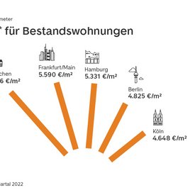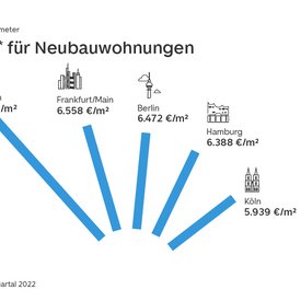 Nach deutlichen Preiskorrekturen im zweiten Quartal von bis zu 5,3 Prozent bei Neubau-Eigentumswohnungen, steigen die Angebotspreise im dritten Quartal wieder moderat an. Bei einem Preisauftrieb zwischen 0,5 und 1,7 Prozent bleiben die Angebotspreise in Köln, Düsseldorf, Hamburg und Frankfurt am Main dennoch circa 100 bis 200 Euro pro Quadratmeter unter dem Niveau des ersten Quartals 2022. München ist mit einem Preisanstieg von 1,2 Prozent mit Abstand weiterhin die teuerste Metropole Deutschlands. Der Quadratmeterpreis liegt im dritten Quartal bei ca. 9.837 Euro und damit über 3.000 Euro höher als bei den restlichen Metropolen. Im Vergleich der sieben Metropolen bleibt Köln die einzige Metropole mit einem Quadratmeter-Angebotspreis unter der Grenze von 6.000 Euro. In den restlichen Metropolen rangieren die Angebotspreise zwischen knapp 6.400 bis 6.700 Euro pro Quadratmeter.