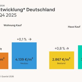Die Preise für Einfamilienhäuser im Bestand entwickeln sich im ersten Quartal 2026 insgesamt stabil. In der gesamtdeutschen Betrachtung steigen die Preiseleicht um +0,8 Prozent. In den Metropolen ist wenig Bewegung. Nur in München erreicht die Preisentwicklung mit +0,8 Prozent das Niveau des Bundesdurchschnitts. Im Jahresvergleich gibt es ein Wachstum von +3,4 Prozent in Hamburg und Leipzig.Im Neubau legen die Hauspreise deutschlandweit eine Pause ein (-0,1 Prozent). In Köln sind die Hauspreise mit +1,6 Prozent am stärksten innerhalb eines Quartals gestiegen. In den übrigen Metropolen bleibt die Preisentwicklung in einer Spanne zwischen -0,2 und +0,4 Prozent. Im Jahresvergleich steigen die Kaufpreise am stärksten in Berlin (+5,0 Prozent) und Hamburg (+3,5 Prozent), während sie in Frankfurt am Main zurückgehen (-1,5 Prozent).