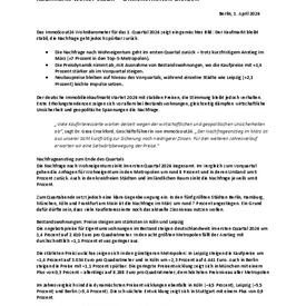 Das ImmoScout24 WohnBarometer ist der Marktreport zur Entwicklung des Immobilienmarkts. Herausgeber ist ImmoScout24: Deutschlands führende Online-Plattform für Wohnimmobilien. Das ImmoScout24 WohnBarometer gibt die Preisentwicklung in realen Angebotspreisen wieder. Die Datenbasis umfasst über 8,5 Millionen Inserate der letzten fünf Jahre auf ImmoScout24. Die Werte werden für Referenzobjekte für den jeweils betrachteten Immobilientyp durch einen Algorithmus aus dem Bereich des maschinellen Lernens ermittelt. Für Wohnungen zum Kauf wird eine Drei-Zimmer-Wohnung mit 80 Quadratmetern Wohnfläche zugrunde gelegt. Das betrachtete Einfamilienhaus hat 140 Quadratmeter Wohnfläche und einen Grundstücksanteil von 600 Quadratmetern. Die Kategorie Neubau enthält alle Angebote mit einem Baualter von maximal zwei Jahren zum jeweiligen Bestimmungszeitpunkt. Die aktuellen Angebotskaufpreise beziehen sich immer auf den letzten Datenpunkt im Marktreport und stehen damit für den Angebotspreis im ersten Quartal 2026.