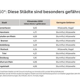 Welche deutschen Großstädte am stärksten von Klimawandelfolgen betroffen sind, zeigt erstmals der Indikator „ Klimarisiko 2050" des aktuellen Städterankings von IW Consult, Wirtschaftswoche und ImmoScout24.