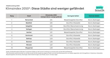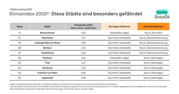 „Die Auswertung zeigt, dass Deutschlands Großstädte unterschiedlich stark von Klimagefahren bedroht sind. Städte, die in Hochwasserschutz, Stadtbegrünung und hitzeresistente Infrastrukturen investieren, stärken ihre Widerstandskraft gegenüber Klimarisiken und schützen Bevölkerung und Infrastruktur“, sagt Dr. Gesa Crockford, Geschäftsführerin von ImmoScout24. „Klimaresilienz wird damit zu einem wichtigen Faktor bei der Bewertung städtischer Standorte – für Kommunen, Unternehmen und private Haushalte gleichermaßen.“