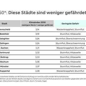 Am wenigsten gefährdet zeigen sich Remscheid (Rang 1), Bielefeld (Rang 2) sowie Salzgitter und Solingen (beide Rang 3). Ihre geografische Lage im Binnenland macht Sturmfluten unmöglich. Zudem liegen diese Städte abseits großer Flüsse, was sie zusätzlich vor Überschwemmungen schützt. Auch sind Hitzewellen weniger wahrscheinlich. Ähnliches gilt für Aachen (Rang 5), Dortmund (Rang 6), Bottrop (Rang 7), Bochum (Rang 8), Münster (Rang 9) und Wuppertal (Rang 10) – allesamt nordrhein-westfälische Städte. Remscheid, Aachen und Wuppertal sind beinah gar nicht von Wasserknappheit bedroht. Hingegen weisen Salzgitter, Münster und Bottrop ein leicht erhöhtes Risiko für Wasserknappheit auf – allerdings auf einem immer noch niedrigen Niveau im deutschlandweiten Vergleich.
