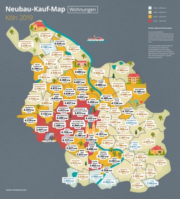 In Köln-Hahnwald kostet die Neubau-Eigentumswohnung im Schnitt 7.483 Euro pro Quadratmeter, was einem Plus von 14,0 Prozent entspricht. Das ist gleichzeitig der höchste Durchschnittspreis und die höchste Preissteigerung im Stadtgebiet innerhalb eines Jahres. Auf Rang 2 liegt Lindenthal mit 7.260 Euro pro Quadratmeter im Schnitt (+ 11,9 Prozent), gefolgt von Altstadt/Neustadt-Süd mit 6.944 Euro (+ 12,3 Prozent) für den Quadratmeter Neubau-Eigentumswohnung.